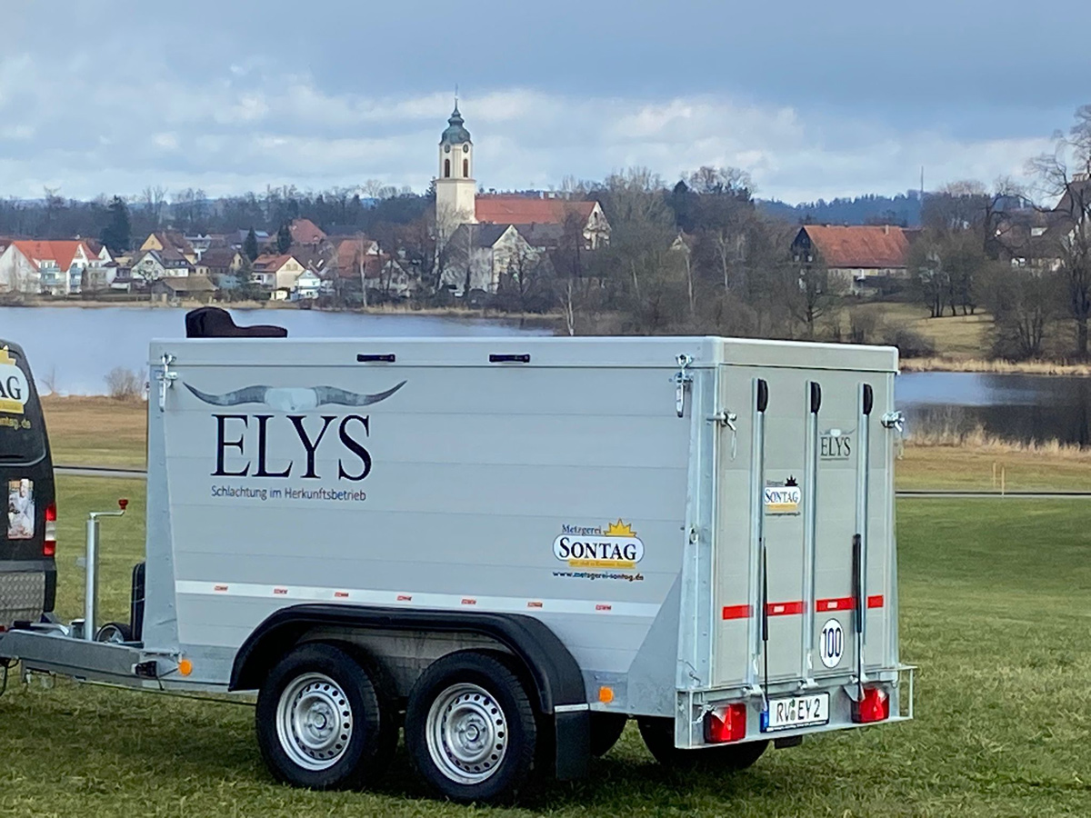 Sollte ein Schlachtbetrieb oder eine Erzeugergemeinschaft den Wunsch hegen, die Schlachtung im Herkunftsbetrieb zu realisieren, bieten wir ein sehr wirtschaftliches Konzept mit dem Anhänger ELYS als Hardware. Darüber hinaus halten wir Formularvorschläge für die zuständigen Behörden bereit, um das ganze so einfach, wie möglich für alle Beteiligten zu gestalten. Die erste ELYS II ist seit Anfang Februar 2022 in der Metzgerei Sontag im Einsatz. Folgende Beteiligte haben Fachverstand, Energie, Enthusiasmus, und unermüdliches Engagement beigesteuert: Metzgerei Sontag, Fahrzeugbau Gomm, Veterinäramt Landkreis Ravensburg, Veterinäramt Landkreis Biberach