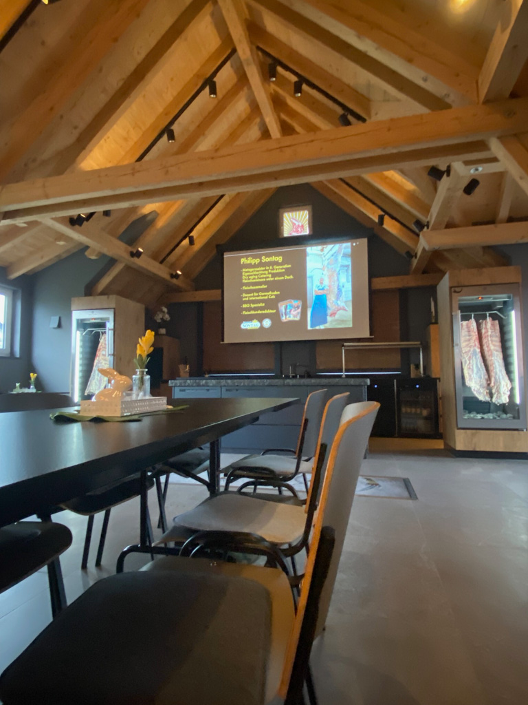 Wir können flexibel möblierbar, Kleingruppen bedienen, aber auch bis zu 35 Personen aufnehmen. Die Fleischbühne ist über einen separaten Eingang zu erreichen, trotzdem ist es bei unseren Schulungen und Kursen jederzeit möglich, für Zerlegung oder Wurstherstellung in den Hygienebereich der Produktion im Gebäude zu wechseln.